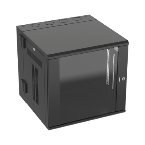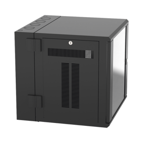 Gabinete de montaje en pared construido en acero, soporta 12 unidades de Rack para equipos de red activos o pasivos. Cuenta con paneles laterales totalmente desmontables y está diseñado para permitir el control de clima adecuado para uso con diversos equipos de red, así como Switches de alimentación remota (PoE) y fuentes de alimentación ininterrumpida (UPS).