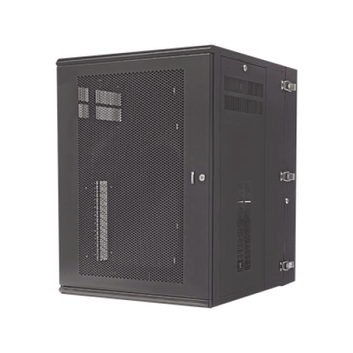 Gabinete de montaje en pared construido en acero, soporta 18 unidades de Rack para equipos de red activos o pasivos. Cuenta con paneles laterales totalmente desmontables y está diseñado para permitir el control de clima adecuado para uso con diversos equipos de red, así como Switches de alimentación remota (PoE) y fuentes de alimentación ininterrumpida (UPS).