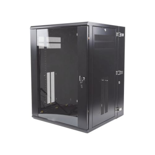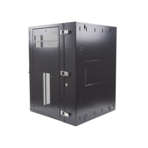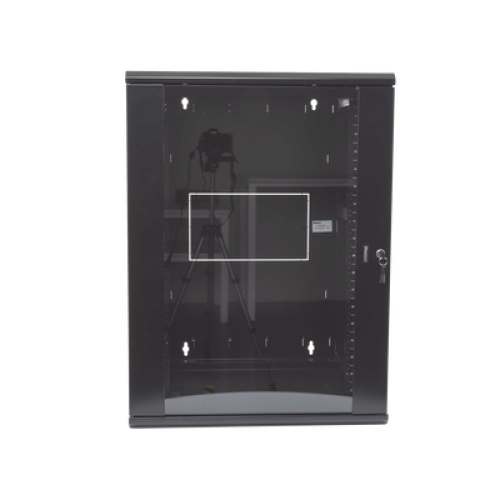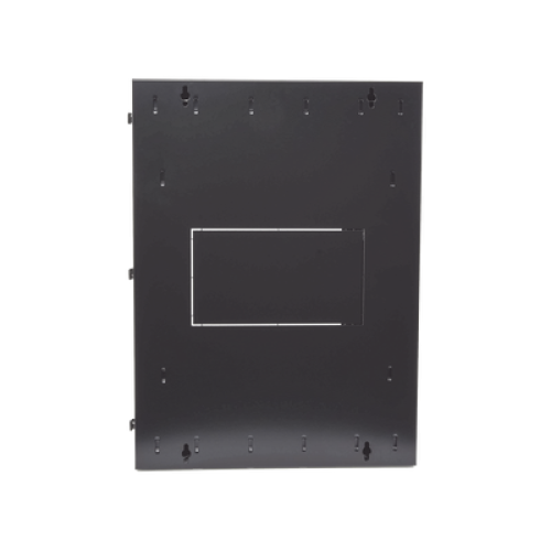 Gabinete de montaje en pared construido en acero, soporta 18 unidades de Rack para equipos de red activos o pasivos. Cuenta con paneles laterales totalmente desmontables y está diseñado para permitir el control de clima adecuado para uso con diversos equipos de red, así como Switches de alimentación remota (PoE) y fuentes de alimentación ininterrumpida (UPS).