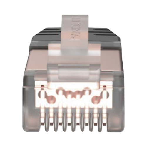 El Plug modular blindado de Categoría 6/Clase E, de 8 posiciones y 8 hilos, se puede terminar en cable de par trenzado blindado sólido o trenzado Panduit de 4 pares, 24-26 AWG, de 100 ohms con un diámetro máximo de aislamiento del conductor de 0.040 pulg. (1.02 mm) y diámetro máximo de forro de 0.250 pulg. (6.35 mm).