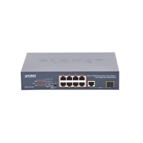 El FGSD-1011HP, un nuevo miembro de la familia de switches PLANET 802.3at PoE Fast Ethernet, proporciona 8 puertos 10/100Mbps 802.3af/at Power over Ethernet, 1 puerto Gigabit y 1 Gigabit SFP con un total de 120 vatios de presupuesto PoE. Su presupuesto de potencia es más que suficiente para cualquier aplicación de red con transmisión de velocidad Fast Ethernet.