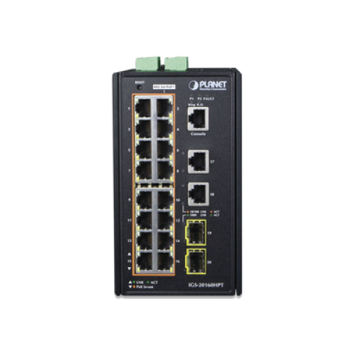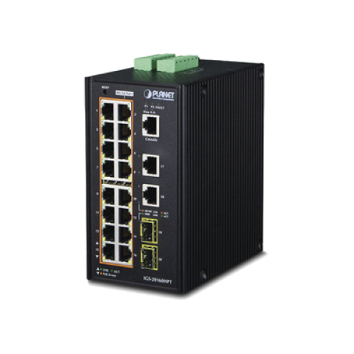 Switch Industrial Administrable 16 puertos 10/100/1000 T 802.3at PoE + 2 Puertos 10/100/1000 T + 2 puertos 100/1000 X SFP