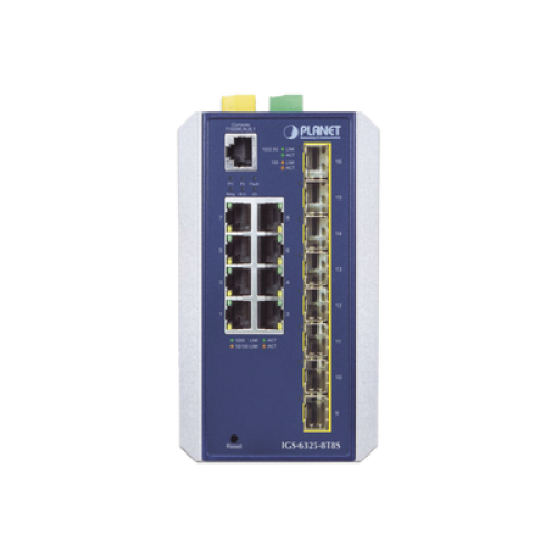 La serie de Switches industriales administrables de capa 3 PLANET IGS-6325 cuenta con 8 puertos de cobre 10/100/1000BASE-T, 8 puertos de fibra SFP 100/1000/2500BASE-X adicionales y enrutamiento IP de capa 3 en una carcasa de metal resistente IP30 para un funcionamiento estable en entornos industriales exigentes.