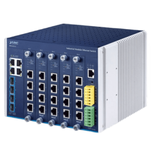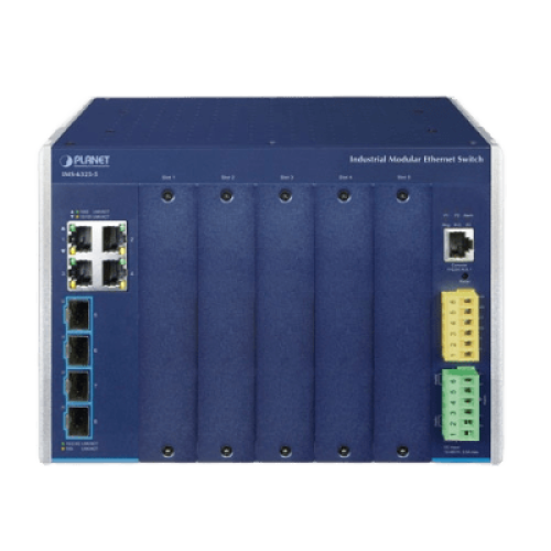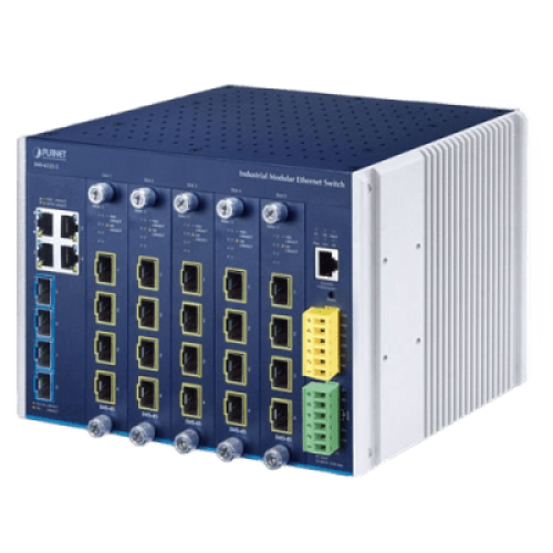 Switch Modular Industrial Capa 3 / 5 Slots / 4 Puertos Gigabit RJ45 / 4 Puertos SFP+ 10G / Rango de Temperatura -40~75°C / Entrada de Potencia Redundante 12-48V / Soporte IPv6/IPv4