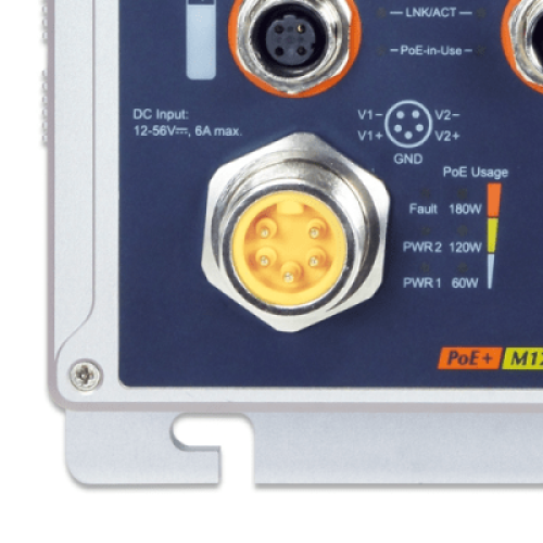 Switch Industrial IP67 8 Puertos 10/100TX M12 / IEEE 802.3at PoE+ / 180W PoE Budget / -40~75°C / Aluminio / DIN-Rail y Montaje en Pared / Protección ESD y Sobretensiones de 6KV