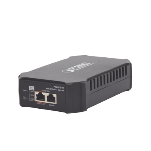 PLANETA POE-175-95 es un solo puerto, inyector de alimentación a través de Ethernet 802.3bt, con un máximo de hasta 95 vatios de potencia de salida durante los cables Ethernet.