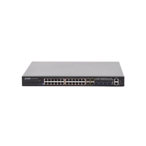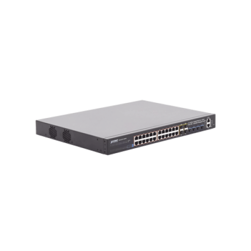 El switch Gigabit gestionado apilable con PoE PLANET SGS-6341-24P4X de capa 3 ofrece un alto rendimiento, enrutamiento estático de capa 3, RIP (Protocolo de Información de Enrutamiento) y OSPF (Primero la Ruta Más Corta Abierta). Con una matriz de conmutación de 128 Gbps, el SGS-6341-24P4X puede gestionar grandes volúmenes de datos en una topología segura, conectándose a la red troncal empresarial o a servidores de alta capacidad. Sus potentes funciones de WRR (Round Robin Ponderado) y seguridad de red permiten al SGS-6341-24P4X un control eficaz del tráfico de datos para aplicaciones de VoIP, transmisión de vídeo y multidifusión en proveedores de servicios de Internet y empresas. El SGS-6341-24P4X cuenta con 24 puertos PoE+ IEEE 802.3at y una potencia PoE de hasta 370 Watts, lo que permite atender redes de videovigilancia IP o VoIP de tamaño mediano a grande a un coste competitivo.