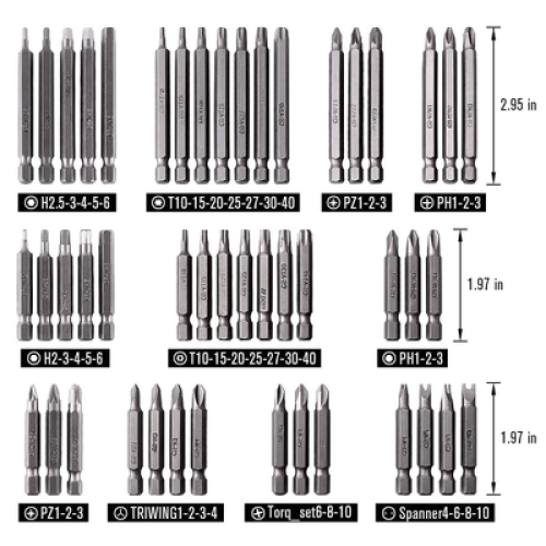 - Juego de 208 puntas de destornillador, incluye Phillips, plano ranurado, cuadrado, Pozi drive, llave de tuercas, Torq, Tri-wing, Torx star, cabeza hexagonal, Tamper proof Torx star, en una variedad de tamaños para una cobertura total.