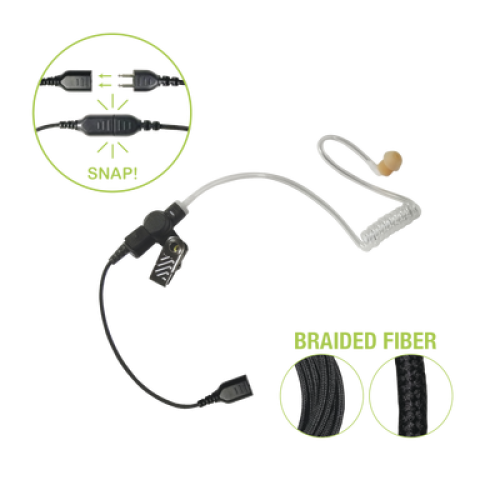 Auricular de tubo acústico transparente con cable de fibra tranzada con conector SNAP tipo MIRAGE. Requiere micrófono de solapa de 1 o 2 hilos de la Serie SNAP.