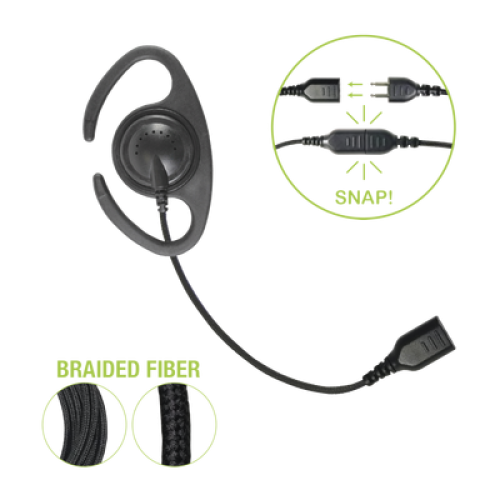 ​Auriculares de gancho en forma de "C" con cable de fibra trenzada y conector SNAP. Requiere micrófono de solapa de 1 o 2 hilos de la Serie SNAP.