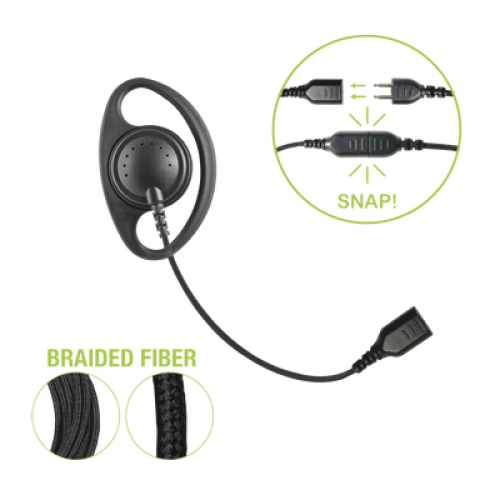 Auriculares con aro en forma de "D" con cable de fibra trenzada y conector SNAP. Requiere micrófono de solapa de 1 o 2 hilos de la Serie SNAP.