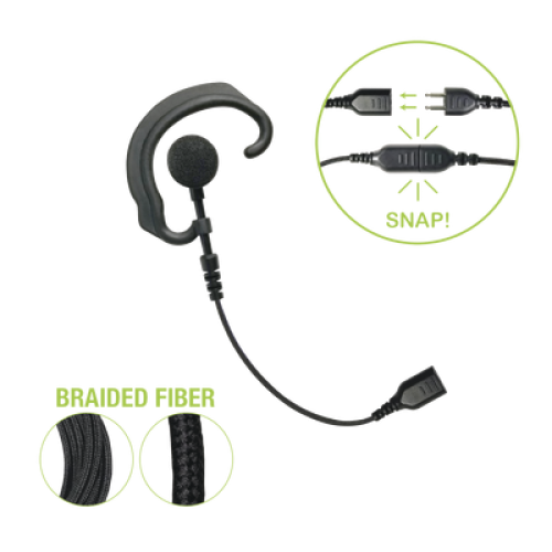 Auricular de gancho para el oído (RESPONDER) con cable de fibra trenzada y conector SNAP. Requiere micrófono de solapa de 1 o 2 hilos de la Serie SNAP.