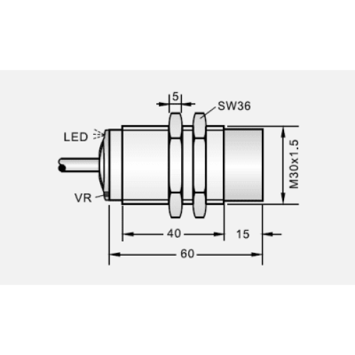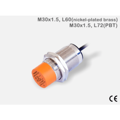 Sensor de Proximidad Capacitivo CBT30-N15PA-D3Y2 / M30 / 15 mm Detección / PNP N.O. / DC 12-24V / IP67 / Cable 2M / Protección Cortocircuito y Polaridad Inversa / −20 a +60°C
