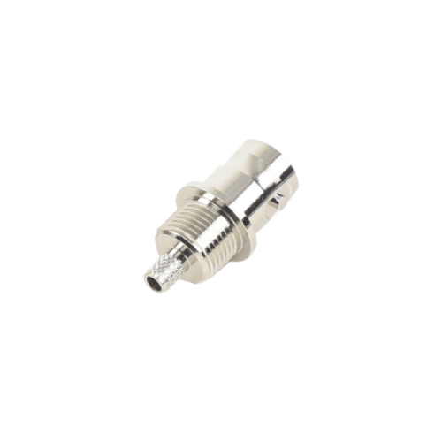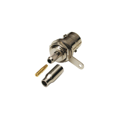 Conector BNC Hembra a 50 Ohm, Montaje Frontal en D-Plano, Anillo Plegable para Cables RG-174/U y RG-316/U, Niquel/ Oro/ Teflón.
