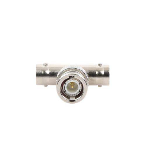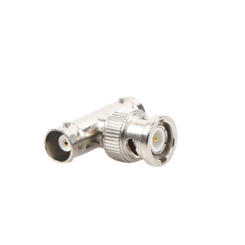 Adaptador en T para 50 Ohm de BNC Macho a Doble BNC Hembra, Troquelado, Níquel/ Oro/ Delrin.