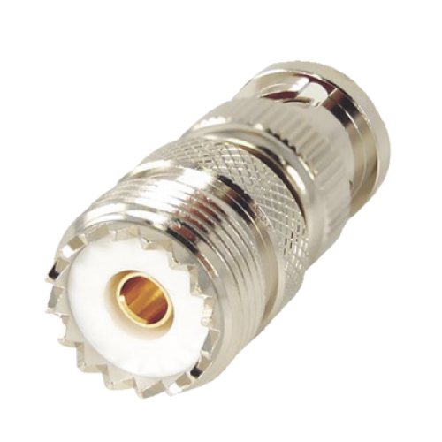 Adaptador en Linea para 50 Ohm, Conector BNC Macho-UHF Hembra (SO-239), Níquel/ Oro/ Delrin.