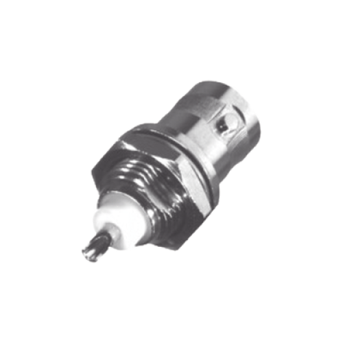 Conector BNC Hembra para Chasis, Montaje Frontal, Soldable, D-Plano, Troquelado, Niquel/ Oro/ Delrin.