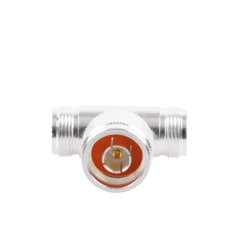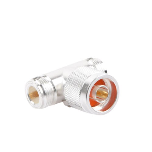 Adaptador en T, de Conector N Macho a Doble N Hembra, Plata/ Oro/ Teflón.