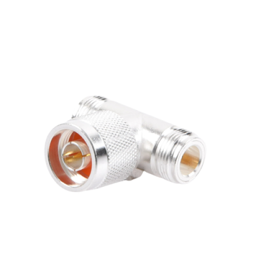 Adaptador en T, de Conector N Macho a Doble N Hembra, Plata/ Oro/ Teflón.