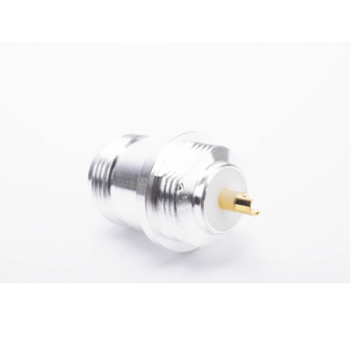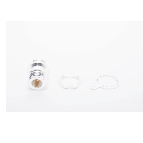Conector N Hembra para montaje frontal en panel, diseño Doble D Plano, con acabados en plata, oro y teflón.