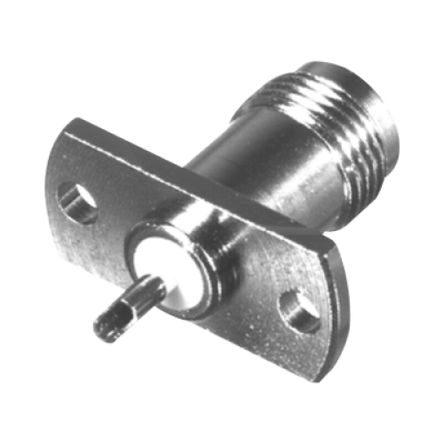 Conector TNC Hembra para Chasis de 2 Perforaciones de 18 mm, Terminal Soldable, Níquel/ Oro/ Teflón.