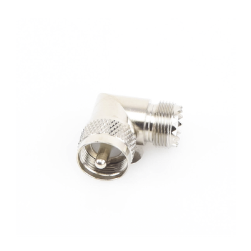 Adaptador en Ángulo Recto, de Conector UHF Macho (PL-259) a UHF Hembra (SO-239), Níquel/ Oro/ Delrin.