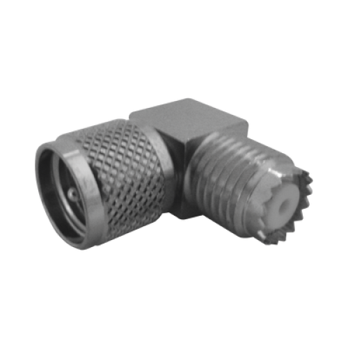 Adaptador en Ángulo Recto, de Conector Mini UHF Macho a Mini UHF Hembra, Cuerpo Cuadrado, Níquel/ Estaño/ Teflón.