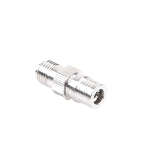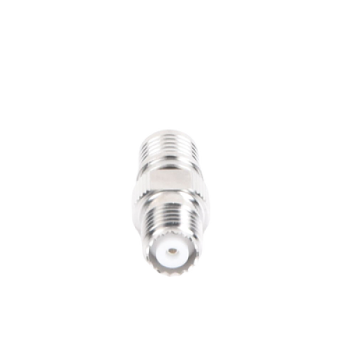 Adaptador en Línea, de Conector QMA (Quick Mate) Macho a Mini-UHF Hembra, Bronce Blanco/ Oro/ Teflón.