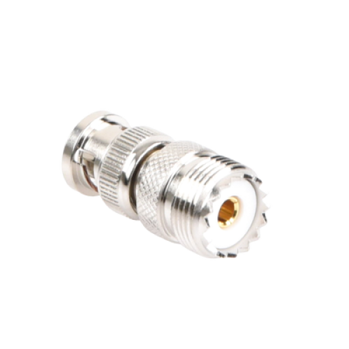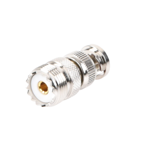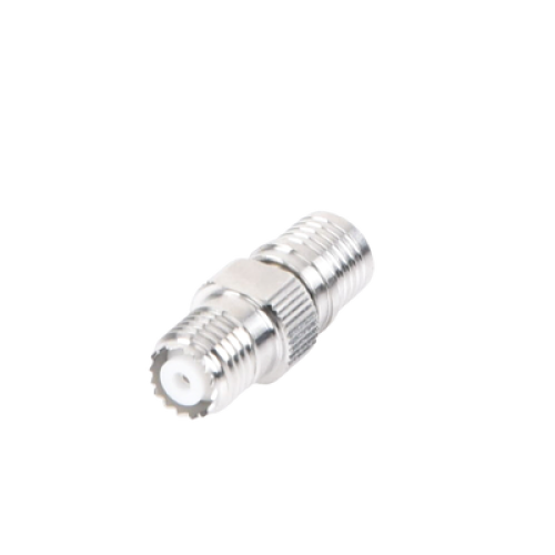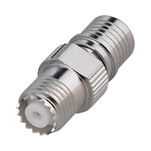 Adaptador en Línea, de Conector QMA (Quick Mate) Macho a Mini-UHF Hembra, Bronce Blanco/ Oro/ Teflón.