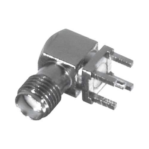 Conector SMA Hembra en Ángulo Recto con Terminal y 4 Patas para Montaje PCB, Níquel/ Oro/ Teflón.​
