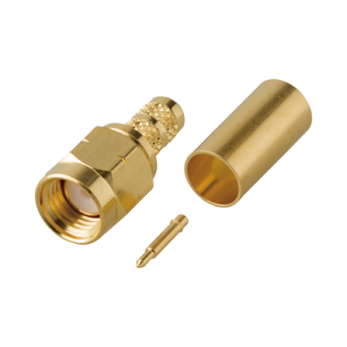 Conector SMA Macho en línea tipo Rosca Izquierda, de Anillo Plegable para Cable RG-142/U y Grupo C1, Oro/ Oro/ Teflón.