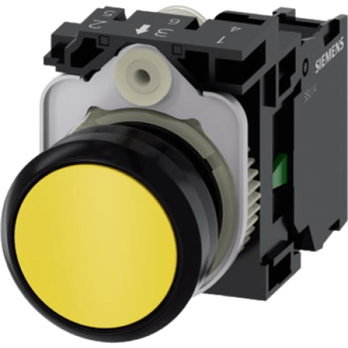 Botón 3SU11000AB301BA0 Sirius 22mm, Color Amarillo, Incluye soporte y contacto Normalmente Abierto.