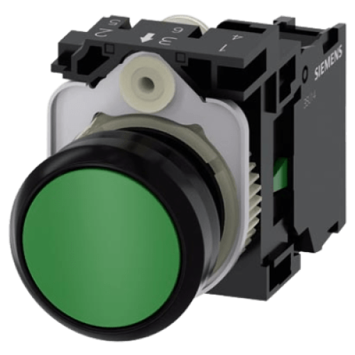 Botón 3SU11000AB401BA0 Sirius 22mm, Color Verde, Incluye soporte y contacto Normalmente Abierto.