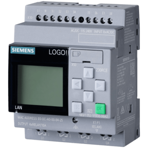 Módulo Lógico LOGO! 230RCE / Display Integrado / Alimentación 115-230V AC/DC / 8 Entradas Digitales / 4 Salidas Relay / Memoria 400 Bloques / Ethernet Integrado / Servidor Web / Data Log / Compatibilidad Cloud / MQTT