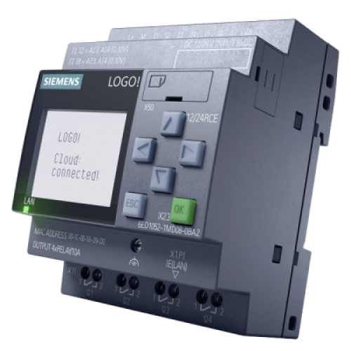 Módulo Lógico LOGO! / 12-24V DC / 8 DI (4 AI) / 4 DO Relay / Ethernet Integrado / Servidor Web / Data Log / 400 Bloques Memoria / Expandible Modularmente / Cloud MQTT / Display Integrado