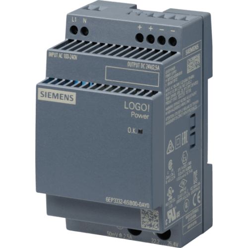 La LOGO!Power 24 V / 2.5 A es una fuente de alimentación estabilizada de alta calidad diseñada para aplicaciones industriales. Ofrece una tensión de salida regulada de 24 V DC con capacidad de corriente de 2.5 A y potencia activa de 60 W. Cuenta con entrada de rango amplio que acepta 100-240 V AC o 110-300 V DC, proporcionando flexibilidad en diversas configuraciones eléctricas. La unidad presenta eficiencia del 89.6% y está certificada para cumplir con los estándares internacionales de seguridad y EMC. Su diseño compacto permite montaje en riel DIN EN 60715 o montaje directo en pared, ideal para integración en cuadros eléctricos y sistemas de automatización industrial.
