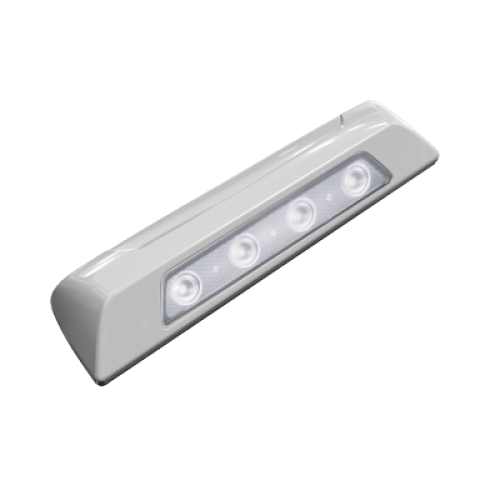 Luz de escena, 4 LED, bisel blanco, 12–24VCD, LED blanco y lente transparente