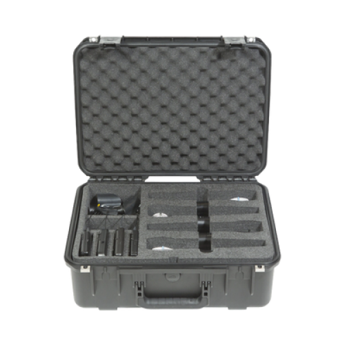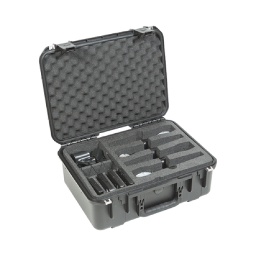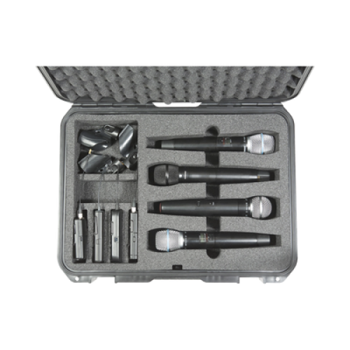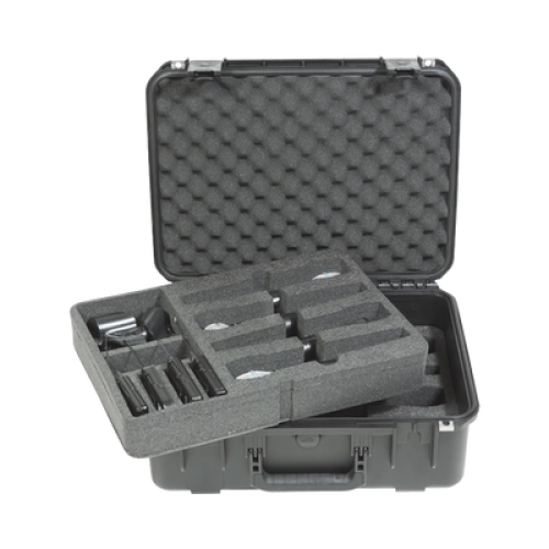 - Interior de espuma de doble capa personalizado para contener ocho micrófonos inalámbricos, paquetes de carrocería y accesorios