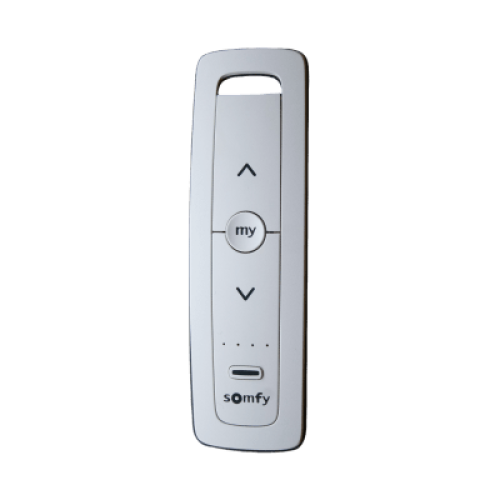 Control remoto 5 canales para motores de persiana Somfy con señal inalámbrica, instrucciones: sube, baja y detener, con posición favorita programada.