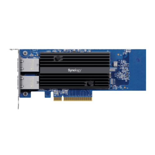 El adaptador de red Synology E10G30-T2 de doble puerto de 10 GbE está diseñado para aumentar el rendimiento de la red en sistemas Synology compatibles. Ideal para empresas que requieren soporte para un número creciente de usuarios en tareas de copia de seguridad, posproducción, virtualización y otras cargas de trabajo con un uso intensivo del ancho de banda.