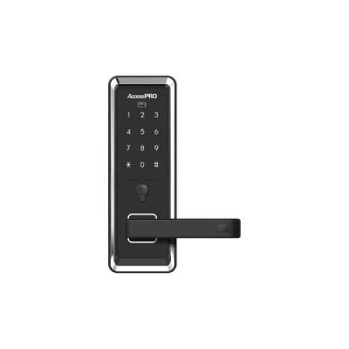 Cerradura inteligente con teclado Touch Screen, Apertura con tarjeta Mifare /Contraseña y Llave de emergencia de diseño compacto para puertas de perilla simple
