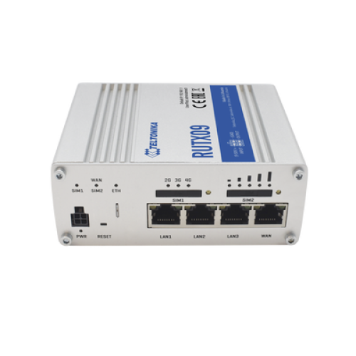 RUTX09 es un router IoT celular LTE-A Cat 6 con interfaces Dual-SIM, Carrier Aggregation y 4 Gigabit Ethernet.