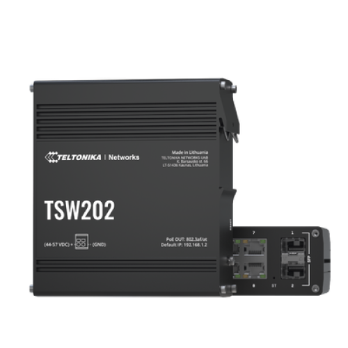El TSW202 es el primer switch administrable PoE+ de Teltonika Networks, diseñado para ofrecer gestión granular de red y distribución centralizada de energía. Ideal para entornos industriales exigentes, combina 8 puertos Gigabit Ethernet con PoE+ (30W c/u, hasta 240W totales) y 2 puertos SFP para comunicación por fibra óptica de largo alcance.