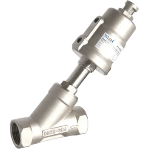 Válvula de Asiento Angular Neumática de 2 Vías / Accionamiento Simple Normalmente Cerrada / Conexión 3/4" NPT / Cuerpo en Acero Inoxidable 304 / Actuador en Acero Inoxidable / Temperatura de Medio hasta +180°C /Presi&o