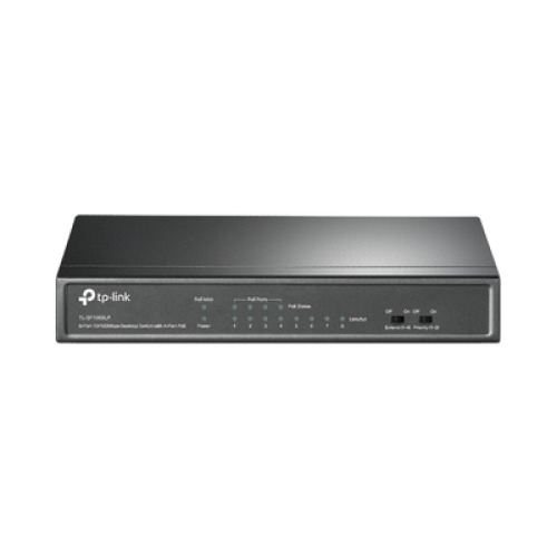 Switch PoE No Administrable de Escritorio / 8 puertos 10/100 Mbps / 4 puertos PoE af / Presupuesto 41 W / Modo extensor PoE hasta 250 metros / Calidad video prioritaria