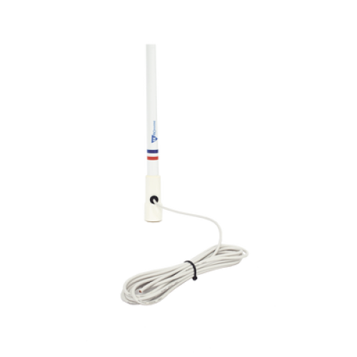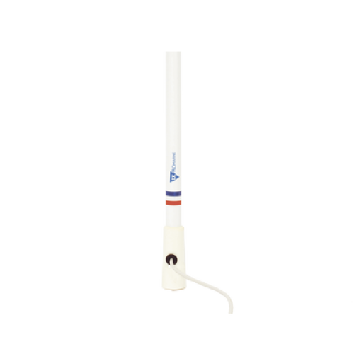 Antena marina VHF en fibra de vidrio en rango de 156 a 163 MHz, Incluye 4.5 metros de cable y conector PL-259 macho.