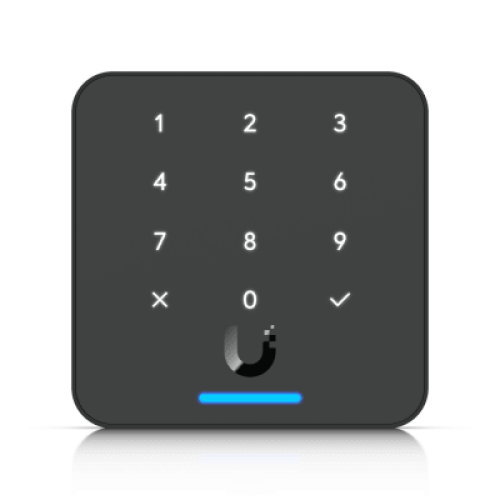 Lector de acceso compacto con teclado capacitivo de 12 botones, soporte para tarjetas y llaveros NFC, Apple Wallet / Google Wallet y desbloqueo móvil, ideal para instalaciones UniFi Access en interior o exterior.
