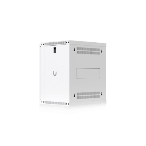 Gabinete para rack 12U de 4 postes para montaje en pared, tipo gabinete cerrado, con puerta frontal de vidrio templado y paneles laterales removibles y con llave.