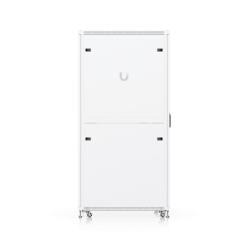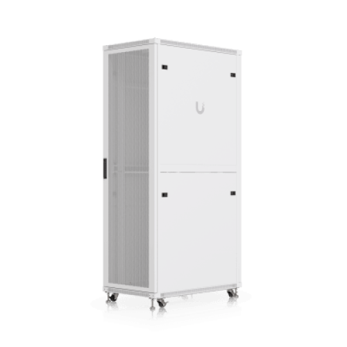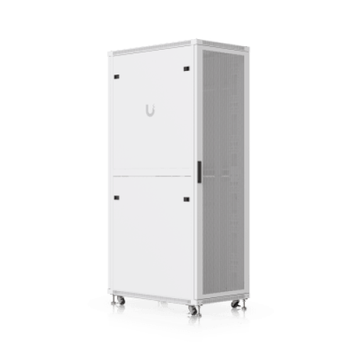 Gabinete para rack 42U de 4 postes, tipo gabinete cerrado, con puertas perforadas, paneles laterales removibles y con llave, y accesorios para gestión de cableado.