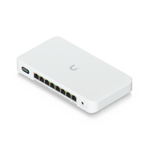 Switch con WiFi 7 integrado para enlaces y distribución de red, con (1) 10 GbE y (7) 2.5 GbE, y (8) puertos PoE+ para alimentar dispositivos, administrable desde UniFi Network.